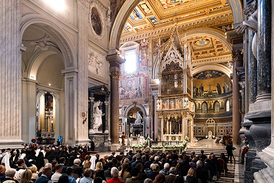 At the start of the liturgy, Cardinal Reina read a profession of obedience to the pope on behalf of the diocese and then the pope sat on the raised marble chair in the basilica’s apse, taking formal possession of the “cathedra” (chair) of the bishop of Rome. He then received representatives of his flock, including clergy and laypeople.