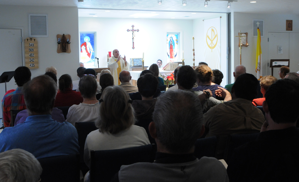 HURRICANE — Saint Paul Mission began as a group of about 20 Catholics who rented the American Legion Hall in Hurricane for Eucharistic services. Six years ago they opened a thrift store to begin funding a church. In 2009, they turned a former office building into a gathering space, with a corner for the thrift store. The Catholic Extension Society provided financial support for the mission at the beginning and continues to assist with the ongoing needs, said Monsignor J. Terrence Fitzgerald, Diocese of Salt Lake vicar general emeritus. "During our first year we only had two SCAP (Sunday Celebration in the Absence of a Priest) services a month," said Toni Foran, who recently stepped down as the mission’s administrator. "Our first task was to try to come up with a way to have more than two, because when you have everybody going to St. George or Mesquite or Cedar City every other week, you never build community." Father Gustavo Vidal, then pastor of Saint George Parish, agreed to have a deacon travel the 20 miles to Hurricane for weekly SCAP services. However, the community continued to grow, doubling in size. Two years ago, when Father Martin Picos became pastor of St. George Parish with Father Tai Nguyen as associate pastor, they committed to a weekly Mass at St. Paul Mission. "Eucharist builds community; that is the reason we have a really big community here now," Fr. Picos said; these days the mission regularly sees 100 people for the Sunday Mass. On May 20, the mission celebrated the third anniversary of its dedication. In his homily, Msgr. Fitzgerald recalled working with the community from the beginning. "Saint Paul Mission has been one of the great blessings for me as a priest, to see how the life of faith has grown here in this community," he said. "It’s not just about the building and how beautiful it is – and it’s true, it’s all so lovely – it’s about the unity, the cohesion and dedication of the community, you caring for each other, you being witnesses to the broader community." Parishioners have made the mission their home, Foran said. For example, one volunteer who sorts items donated to the thrift store does her work outside, "so a couple of the guys decided to build her a tarp to give her shade out there. Nobody said, ‘Do we need this?’ It just got done," Foran said. "Somebody decided it was their job to come on Saturday and blow off the front walkway to make sure that it was ready for Sunday. Somebody else decided it was their job to hold the door and greet people. There have been so many things. It’s been like hundreds of miracles." Having the mission "means everything," said Carol Musich, co-manager of the thrift store; her husband, Don, publishes the parish newsletter. "We were driving to St. George, and we really didn’t know anybody. We weren’t part of the community there because we had to drive so far to go to a meeting or be part of a group. This way we are so very, very close. Everybody knows everybody’s name, and you just feel so much a part of it because you do recognize faces and all that. If you ask for help, you get it. When we moved the thrift store, we put a notice out and we had more people than you would believe in here helping us." Earl Bond has volunteered as the mission’s new administrator. "It needed to be done," he said. "My wife and I talked about it and decided it was something we can do." After moving to Hurricane six years ago, the two of them chaired the campaign for the building fund, and he already has a typed list of things he would like to accomplish in his first year as administrator. First, though, is the assignment he received from Fr. Picos on May 20: to organize a bilingual event for the Feast of Saints Peter and Paul on June 29.