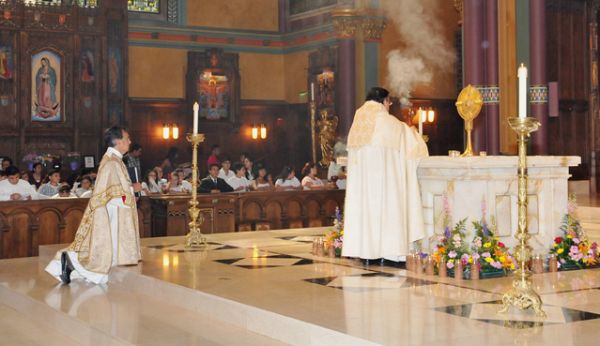 Pbro. Eleazar Silva Galván, Vicario Parroquial de la Catedral de la Magdalena Eran las tres en punto de la tarde, la campana mayor de Catedral, San Miguel, estaba llamando a Misa, los fieles se congregaban en gran número y la fiesta estaba por empezar. Sobre el altar mayor del templo, montado en la custodia principal, estaba el Santísimo Sacramento, expuesto para la adoración. Es la solemnidad de Corpus Christi, el Santísimo Cuerpo y Sangre de Cristo, que desde el año de 1263, se celebra en la Iglesia universal el jueves posterior al domingo de la Trinidad. Aquí en Estados Unidos se observa el domingo, para faci-litar la asistencia del mayor número de feligreses posible. Se reservó el Santísimo, y con la Catedral de La Magdalena abarrotada, comenzó la Misa Solemne. Entre la multitud presente, destacaban los niños, que ataviados con su traje de primera comunión o de inditos, eran los invitados de honor en el homenaje a Jesús Eucaristía. En la Misa se destacó el triple carácter de la celebración eucarística, a saber: recordar, celebrar y creer. En la Misa, la Iglesia hace el memorial de la pasión, muerte y resurrección de Jesús, fuente de nuestra salvación; celebra la victoria de Jesús el Cordero de Dios, que vive y reina a la diestra de Dios Padre; y profesa su fe en la presencia de Jesús, que con su Cuerpo, Sangre, Alma y Divinidad, viene a nosotros en el Pan y el Vino del altar. Esta fe se cristalizó en la liturgia de la Eucaristía que se celebró con gran devoción y en las innumerables comentarios que se distribuyeron. Después de la oración de post-comunión, se expuso de nuevo el Santísimo Sacramento y se formó la procesión. Acólitos, coro, ministros litúrgicos, niños y la custodia seguida de todos los fieles, hicieron guardia a Jesús Eucaristía que salió por la puerta principal para bendecir nuestra ciudad. La procesión siguió por South Temple y la calle C, entró al atrio de Catedral y se detuvo por un instante para hacer la primera posa. Se ofreció incienso con un sahumerio indígena, con tres cruces, una por cada Persona de la Trinidad y se impartió la bendición, que la multitud recibió de rodillas. Luego con las letanías del Santísimo entonadas por el coro catedralicio, continuó la procesión de regreso al interior del templo. Este de nuevo se abarrotó, y en medio de un respetuoso silencio, se rezó la última plegaria, se ofreció el incienso y se impartió la bendición, que tuvo como intención a las familias de nuestra diócesis. La Santa Iglesia Catedral de La Magdalena honró así a Cristo Eucaristía. La procesión, signo de nuestro caminar por este mundo hacia Dios, es una de las tradiciones más relevantes de esta fies-ta. Ser cristiano es andar por el camino en pos de Jesús. Pero no es un caminar a ciegas, él va con nosotros, nos guía y alimenta. No nos deja solos. El Pan y el Vino santísimos, son la fuerza y el sostén de nuestro andar. Jesús delante nos guía, Jesús al lado nos sostiene, y Jesús detrás nos protege. con Pan y Vino se anda el camino.