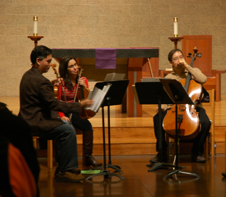 The La Catrina Quartet presented a concert at Saint Thomas Aquinas Catholic Church in Hyde Park on Feb. 20. Shown are violinists Daniel Vega-Albela and Javier Arias. Not shown are cellist Roberta Arruda and Jorge Martinez, viola. The free concert was sponsored by the Chamber Music Society of Logan as a community outreach event. La Catrina Quartet is in residence at New Mexico State University and tours regularly throughout the United States and Mexico. The quartet presented works by various Mexican composers, presenting introductions to the works in both English and Spanish. A reception to meet the musicians was held immediately following the concert in the parish social hall. The next concert at St. Thomas will be on April 25 and will feature the Utah State University Chamber Singers and other choral groups.