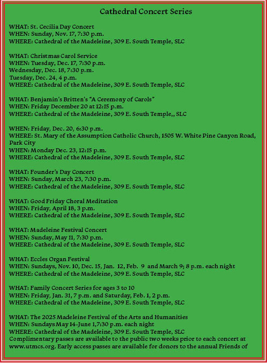 All performances at the Cathedral of the Madeleine, 309 E. South Temple, SLC unless otherwise noted.