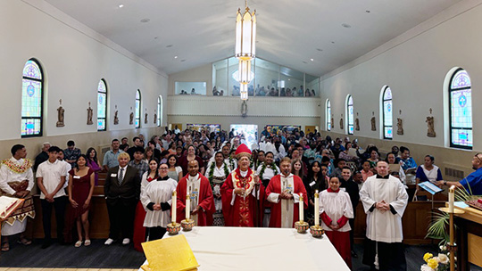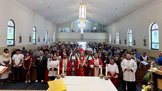 Bishop Oscar A. Solis celebrated the Sacrament of Confirmation at Saint Patrick Catholic Church in Salt Lake City on June 30. The congregation reflects an “awesome rich and colorful diversity” of cultures, the bishop said, with Tongans, people from Myanmar and various African and European countries, Filipinos, Anglos, Native Americans and Latinos.