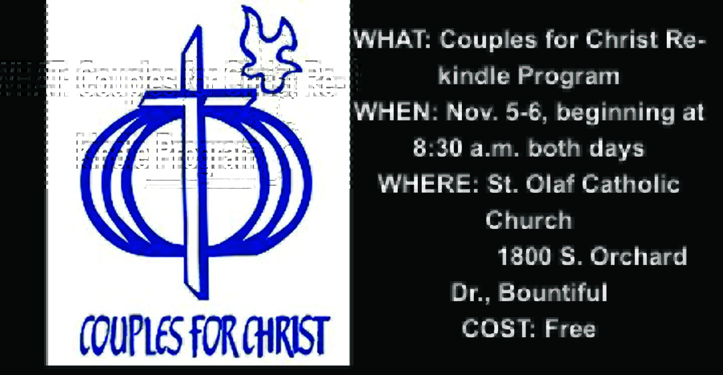 BOUNTIFUL — Rekindle, a two-day Christian Life program where couples and individuals can learn about Couples for Christ’s mission of evangelization for families, will be held on Nov. 5-6, sponsored by St. Olaf Parish and the diocesan Office of Family Life.