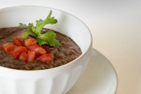 In a large pot, sauté onion and garlic in oil until brown. In a blender, combine 1 c water/vegetable broth and 2 cans of beans. Blend until smooth. Add to onion mixture. Stir in tomatoes, chilis, remaining beans, spices and remaining water/broth. Bring to a boil. Reduce heat, cover and simmer for 15 minutes. Serve with cilantro.