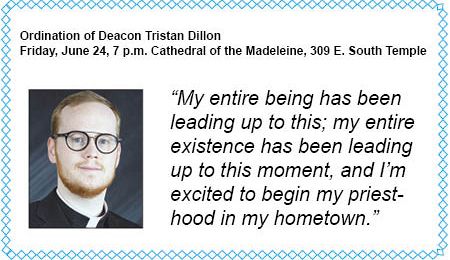 SALT LAKE CITY — A devotion to St. Joseph the Worker developed during his teenage years put Tristan Dillon on the path to the priesthood. He was ordained a deacon last year, and on June 24, the feast of the Sacred Heart of Jesus, he will be ordained a priest by Bishop Oscar A. Solis at the Cathedral of the Madeleine.