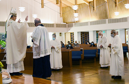 CEDAR CITY — Two decades ago, on Nov. 19, 2000, the Most Rev. George H. Niederauer, eighth Bishop of Salt Lake City, ordained five men from Washington County as permanent deacons for the diocese. They then went forth as ministers of word, as ministers of sacrament and as ministers of charity, serving in the parishes of St. George and Christ the King. As time passed, two have died, but they were recalled during a recent Mass of Thanksgiving celebrated by Bishop Oscar A. Solis in honor of the 20th anniversary of the deacons’ ordination.
