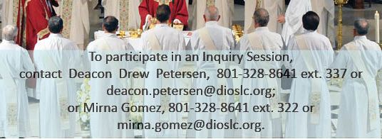 More information can be attained by participating in one of the upcoming Inquiry Sessions hosted by the Office of Deacons. All Inquiry Sessions will be held virtually. To participate in an Inquiry Session, contact Deacon Drew Petersen, 801-328-8641 ext. 337 or deacon.petersen@dioslc.org; or Mirna Gomez, 801-328-8641 ext. 322 or mirna.gomez@dioslc.org.