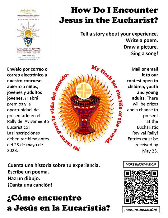Detailed contest information may be found at https://www.dioslc.org/eucharistic-revival/morning-rally-mass/youth-creative-work-contest. Electronic entries should be submitted as an attachment and emailed to Rally@dioslc.org. Other entries may be mailed to c/o Ruth Dillon, Director, Office of Worship, 27 C Street, Salt Lake City, UT 84103. Entry deadline is May 23.