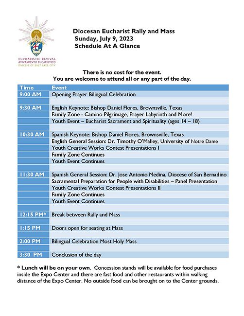 The Diocesan Eucharistic Rally and Mass will take place at the Mountain America Expo Center in Sandy; Catholics from all the diocesan parishes and missions are invited to participate.