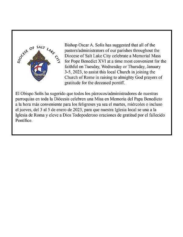 Bishop Solis has suggested that all of the pastors/administrators of our parishes throughout the Diocese celebrate a Memorial Mass for Pope Benedict at a time most convenient for the faithful on Tuesday, Wednesday or even Thursday, January 3-5, 2023, to assist this local Church in joining the Church of Rome in raising to almighty God prayers of gratitude for the deceased pontiff.