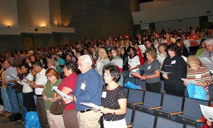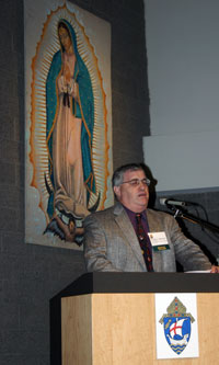 DRAPER — In today’s rapidly changing and challenging world, getting out the Good News of Jesus Christ’s resurrection and our salvation is more difficult than ever and more important than ever, said Daniel S. Mulhall, a staff member of the United States Catholic Conference (USCCB) Office of Catechesis and a member of the Bishops’ Committee on Catechesis. In his keynote speech to more than 500 religious educators at the 2006 Diocesan Religious Education Congress Sept. 30 at the Skaggs Catholic Center in Draper, Mulhall said the mission Jesus gave his disciples is the same mission religious educators have today: "Go, make disciples of all nations, baptizing them in the name of the Father, Son, and Holy Spirit, teaching them all that I’ve taught you." As catechists, he said, "we take seriously the mission that Jesus gave us. We are in the business of making disciples – it’s what we do. We do this through the message we teach, through our lives of prayer and Christian witness, and through our love and care for those entrusted to us." Mulhall urged catechists to evangelize, "for if we don’t evangelize, discipleship will not happen. "Catechesis nurtures the seed of faith sown by the Holy Spirit," Mulhall said. "It gives growth to the gift of faith given in baptism and makes the sacraments come alive. Catechesis develops a deeper understanding of the mystery of Christ, encourages more profound incorporation into the Church, and nourishes Christian living. It encourages discipleship in Christ and instructs in Christian prayer. Just as the mission of evangelization enlivens the Church’s pastoral and missionary activity, catechesis makes concrete her mission of evangelization. It constitutes the Good News that Christ commissioned his apostles to spread throughout the whole world and announce to very person." Mulhall said religious educators need to stop seeing themselves as teachers and start seeing themselves as matchmakers, helping people fall in love with God. He encouraged them to make ample use of the "General Directory for Catechesis" and the "National Directory for Catechesis," both valuable documents that "make clear to us that faith can only be lived within a culture. "People have to take the Word of God and make it their own where they live, work, and play..." He urged Utah’s religious educators to know and understand the unique culture in which they and their students live. Mulhall spoke of the global culture, the regional culture, and the local culture, all of which impact and shape us. All evangelization, all catechesis, is local, personal, and relational, and as catechists develop loving relationships with those they catechize, their students will come to a loving relationship with Christ. He cautioned catechists not to let a person’s skin color, nation of origin, or language stand in the way of good catechesis. "It does no harm for me to accept the culture that shaped me and recognize the good things it has given me. But I alone am responsible for acting out of the attitudes I learned. I can blame no one else for my actions. I must do this, not because it is politically correct, God help us, but because that is the only way I can evangelize and catechize others." The Congress offered 23 workshops in four sessions, one in each session in Spanish. Auxiliary Bishop Gabino Zavala of Los Angeles presented a keynote speech in Spanish that emphasized the importance of being sensitive to the culture in which people live, but not letting the secularized culture consume people to the exclusion of their faith lives. Odgen Deacon Michael Bulson spoke of the search God makes for each one of us, and asked a full workshop, "Is God looking for you? Referring to the writings of Thomas Merton and Rabbi Rami Shapiro, Deacon Bulson, who serves St. Joseph Parish, led his workshop to a deeper understanding of contemplation and contemplative prayer. "We need to re-create conditions in which we can get to know God and God can know us," he said. "We need to be awakened to the awareness of God." Deacon Bulson spoke of finding God in nature, in scripture, and in Jesus Christ. "Our spiritual journey leads us back to our interior; back to God," he said. "We have to be aware that it is the Incarnation, that Christ event, that allows us to journey back to God." The Congress contained as strong thread of service to others as evidenced in the workshops of Deacon Forrest Gray, Father James Flynn, Dr. Kandie Brinkman, Diocesan Government Liaison Dee Rowland, and Maria Cruz-Gray, director of the Diocesan Office of Hispanic Ministry. Scripture also played a role in presentations by Mary Ann Barnett, Sister of St. Louis Brid Long, Father Sam Dinsdale, Dulce Jiménez-Abreu, Marcella Burden, and William Trentman. At the closing Mass of the Congress, Diocesan Administrator Msgr. J. Terrence Fitzgerald thanked catechists for the work they do on behalf of the people in their parishes and the Diocese of Salt Lake City. He spoke with concern of "the extensive ignorance of the faith." "We know well that too many adults, as well as young people, fail to grasp the essentials of our faith, whether we speak of sacred Scripture, liturgy, devotions, church history, prayer, or the catechism," he said. "We have wonderful educational resources available for us today, yet many still fade away from a faith tradition they never really understood. That is certainly a pastoral concern that we face in our various ministries." Drawing from the Gospel of the day, Msgr. Fitzgerald said Saint Mark challenges us to reflect on one specific aspect of pastoral care, "the need for our ministry to be all-embracing and inclusive, on reflecting a hospitality that keeps the welcome mat out and our greeters at the church door. I would add, one that encourages us to seek out those whose stories we might not know, but whose families hunger for faith." Using the words of Pope Benedict XVI, he said, "Those who work in the name of the Churc