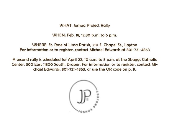 The Joshua Project will host its first youth rally on Feb. 18 at St. Rose of Lima Parish in Layton. All diocesan parishes and missions have been invited to send youth leaders, and encourage their youth ages 14-18 to attend.