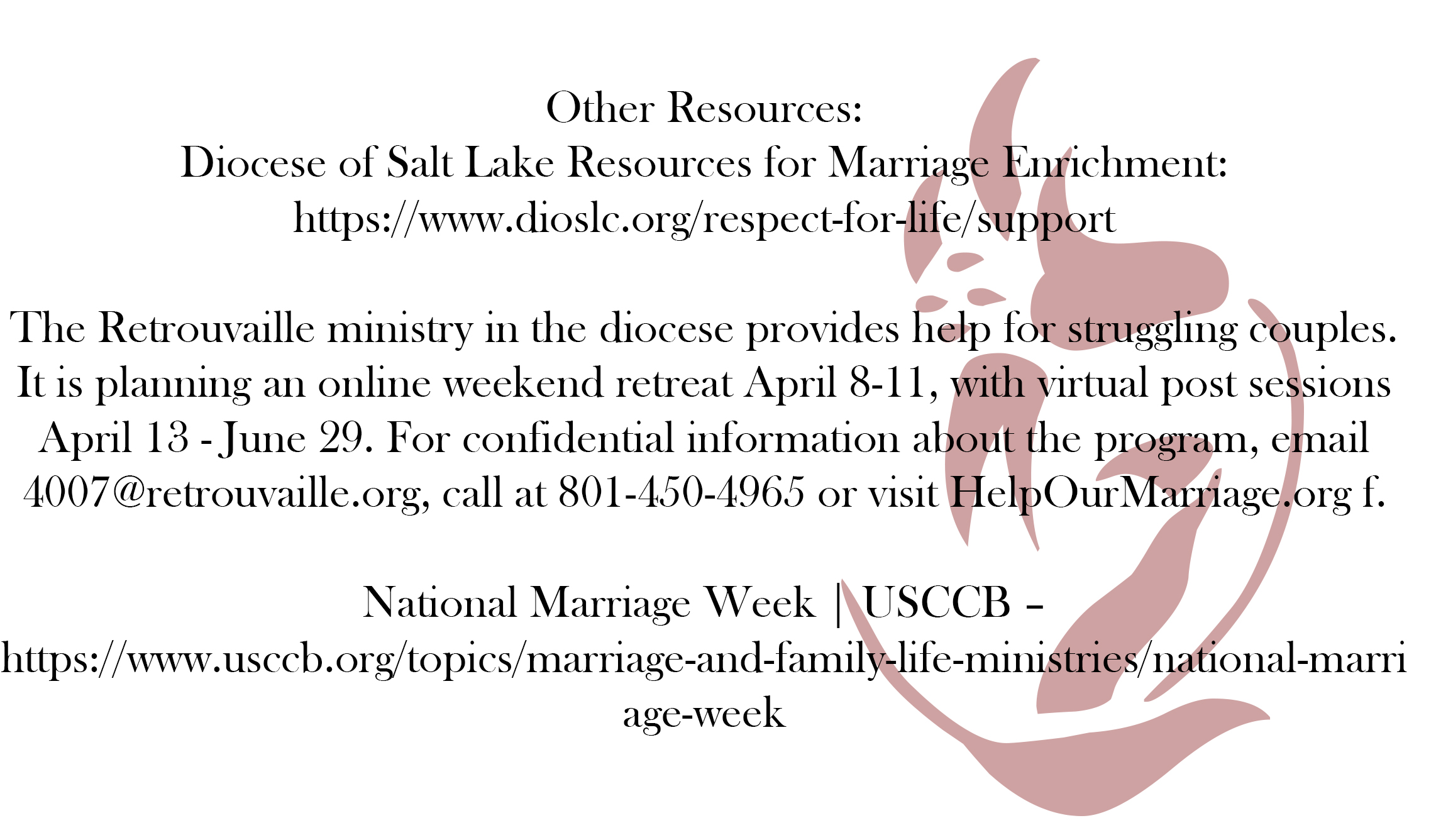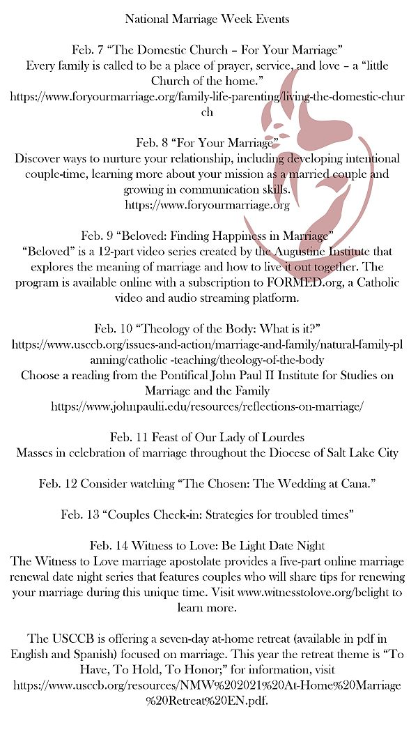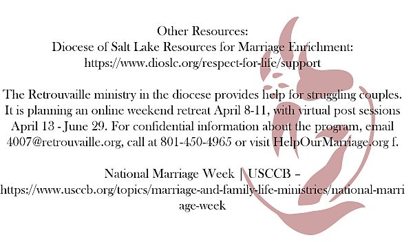 Diocese of Salt Lake Resources for Marriage Enrichment: https://www.dioslc.org/respect-for-life/support