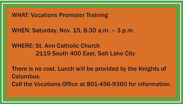 The daylong event, called Hundredfold, will be held at St. Ann Catholic Church in Salt Lake City. It will feature training in English and Spanish by speakers from Vocation Ministry, “a non-profit organization committed to the work of vocation promotion to Catholic parishes and dioceses throughout the United States and Canada by providing practical hands-on resources, workshops and presentations to equip those seeking to promote vocations at all levels within the Church,” according to its website.