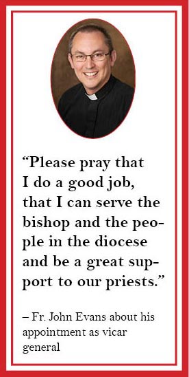 “I am confident that Fr. John Evans will make a wonderful vicar general,” Msgr. Bircumshaw said. “He is a good, dedicated and holy priest. He has many skills in management and accounting that most priests do not come to priesthood with, which skills will assist him well in the administration of the diocese – especially in managing the overall budget and coordinating the oversight and development of the lay and clerical staff at the Pastoral Center. He relates well to a wide variety of theological views of the Church and has a good sense of humor. He is mature and has a professional but warm approach to ministry and is respected by his fellow priests. With the grace of office promised to him in his role as the bishop’s vicar, he should ‘soar as on eagle’s wings.’”