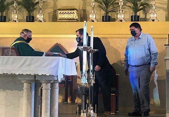 Knights of Columbus Utah State Deputy Nick Nielson and Grand Knight Mike Dannenmuller from the Knights’ council at Holy Family Parish in South Ogden present a check for $3,000 to Father William Wheaton, the parish pastor, to put toward repairs suffered in the high winds in September. The money came from the Knights of Columbus Disaster Relief Fund.