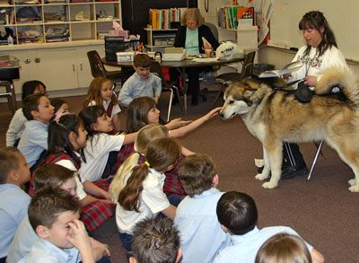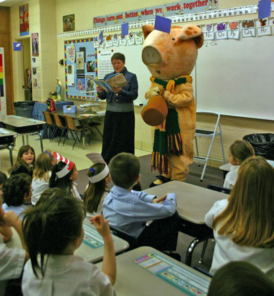 KEARNS — Students and teachers at St. Francis Xavier Regional School in Kearns take reading very seriously, and when a momentous day like the birthday of Theodore "Dr. Seuss" Geisel comes around, it reminds the students that it’s a good day to read a book. Participating in the National Education Association’s "Read Across America" Program, the school invited parents, religious and civic leaders, and ordinary people to come to the school and share their favorite books by reading to the students. Students heard from dog owners who brought their dogs along for the day, including Allen Crist, a K-9 policeman and his bloodhound, Wyatt Earp; KUTV Newsman Peter Rosen, Father John B. Hart of the Cathedral of the Madeleine, Father Rob Moriarty of St. Francis Xavier Parish, Holy Cross Sister Patricia Reilly of the Diocesan Office of Diaconate Formation, and Daughter of Charity Sister Stella Marie Zahner of the Diocesan Office of Catholic Schools. Cammie Kirkham of Border’s Books brought a six-foot pig along to illustrate her book selection, "Give a Pig a Pancake." Readers also came from Juan Diego Catholic High School. Judge Memorial Catholic High School theater students presented a reader’s theater production featuring children’s books, and drama students from West Jordan High School presented production selections from "Seussical," a musical comedy based on the books of Dr. Seuss. Kay Fassio, who has grandchildren attending St. Francis Xavier School, also read to students. Principal Nancy Essary said it was a busy day, "but it was exciting and fun." The students were receptive to the day, which has become an annual event. They seemed to like the break in the routine, and enjoyed having dogs to pet, new stories to share, and plenty of guests with which to share the day.