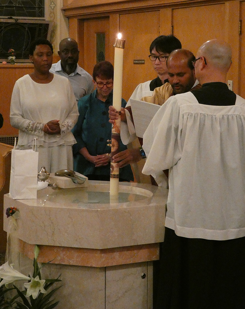 At the Easter Vigil, Fr. Anil Kakumanu, administrator of Our Lady Of Lourdes Parish in Salt Lake City, blesses the baptismal water.