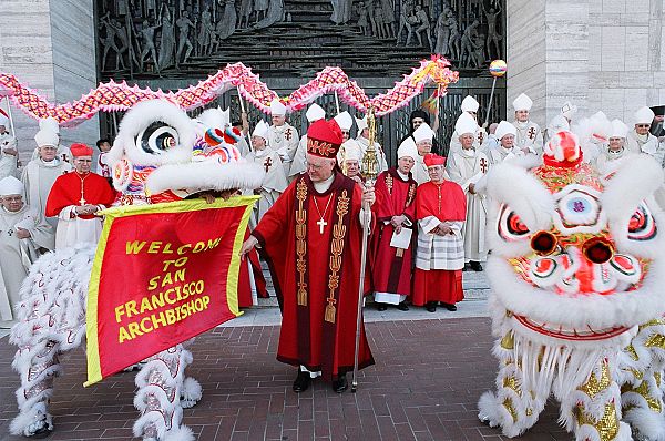 SAN FRANCISCO, Calif. — Durante dos días, el Arzobispo George Niederauer, el octavo Arzobispo de San Francisco, cuidadosamente estableció el tono de su próximo término. Durante su primera Misa en la presencia del clero de San Francisco, en un almuerzo con sus hermanos obispos de los Estados Unidos, en su Misa de instalación y la recepción después, y en una cena con sus familiares y amigos, él habló de servicio. El Arzobispo Niederauer prometió servir al clero y a la gente de la Arquidiócesis de San Francisco así como a la ciudad en general. Él elogió el servicio del clero, de los religiosos y de las mujeres y hombres laicos de la Diócesis de Salt Lake City, donde su término como el octavo obispo terminó con su nombramiento a San Francisco, y él llamó al clero, a los religiosos y a la gente de su nueva arquidiócesis al servicio de la iglesia y de los unos a los otros. Los sacerdotes de la Arquidiócesis de San Francisco, sus diáconos y sus esposas se reunieron el 14 de febrero en la Basílica Misión Dolores para lo que para la mayoría de ellos fuera su primera liturgia con su nuevo arzobispo, el aún por ser instalado Arzobispo George Niederauer. El servicio, en memoria de San Cirilio, monje, y San Metodio, obispo, comenzó a las 4 p.m. El Arzobispo fue recibido en la basílica por dos de su predecesores en San Francisco, Arzobispo Emérito Joseph Quinn y Arzobispo Emérito William Levada, amigo de muchos años y compañero de clases del nuevo arzobispo, y ahora el Prefecto Vaticano de la Congregación de La Doctrina de la Fe. Los dos obispos auxiliares de la arquidiócesis, Obispos Ignatius Wang y John C. Wester, quien durante los últimos seis meses actuó como administrador apostólico de la arquidiócesis, recibieron a su nuevo arzobispo con sonrisas y apretones de mano. Cuando el Arzobispo Niederauer se paró en el santuario de la basílica luciendo una capa blanca, él recibió un gran aplauso, la primera de muchas ovaciones que él recibiría en su nueva diócesis. De la Diócesis de Salt Lake City, Monseñor Michael J. Winterer, párroco de la Parroquia Cristo Rey de Cedar City, y el Padre Dominicano Peter Rogers, párroco de Sta. Catarina de Siena del Centro Newman en la Universidad de Utah, también participaron en la liturgia. El coro de la Basílica Misión Dolores, bajo la dirección de Jerome Lenk, director de música y liturgia, cantó la composición hecha por Lenk de la "Oración de San Francisco", las palabras de la cual se atribuyen a San Francisco de Asís, el santo patrón de la arquidiócesis. La liturgia bilingüe incluyó salmos, cantos, y una lectura de la segunda carta de San Pablo a la Iglesia en Corintia. «Aquí, los siervos se reúnen», dijo el Arzobispo Niederauer en su homilía, «y mañana los siervos se reunirán con aquellos que son servidos – en realidad todos somos llamados a servir.» El Arzobispo dijo que los sacerdotes Católicos son ministros de servicio, ordenados por los sacramentos, especialmente el Sacramento de las Ordenes Sacerdotales, «Nosotros no merecemos ni tampoco ganamos este honor.» El Arzobispo Niederauer urgió al clero a que no se vea intimidado por el pequeño número de sacerdotes, por la soledad, o por el desaliento. Citando al Padre Robert Barron de la Arquidiócesis de Chicago, él les recordó; «Sus vidas no son propias de ustedes. Procedan con precaución … todo debe ser por la gloria de Dios.» La luz de Cristo brilla por encima de la oscuridad, él dijo, agregando que aunque todos ellos son vasijas de barro, la luz de Cristo es más importante que su humanidad. El Arzobispo Niederauer prometió ser padre, hermano, amigo y colaborador cercano de los sacerdotes y los diáconos y sus esposas. «No puedo prometerles ser un siervo-lider perfecto, pero juntos podemos hacerlo mejor. Les pido que recen por mí como yo rezaré por ustedes. Pidan ayuda si la necesitan. Debemos depender los unos de los otros. Sean humildes. Amén. Sepan que lo que decimos, lo decimos por Cristo; lo que hacemos, lo hacemos por Cristo. Somos llamados para enfrentar las necesidades que encontremos en el contexto de la oración y de un buen pastor en medio de su rebaño.»