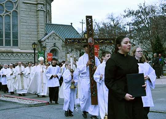 Al finalizar las lecturas los participantes procesaron hacia el frente de la Catedral. Fueron guiados por varios servidores de altar quienes llevaban incienso, una cruz con una reliquia de la Verdadera Cruz, otros llevando velas, seguidos por el coro pro los diáconos, el Obispo Solis y otros ministros. Durante la procesión se recitó la Letanía de los Santos.