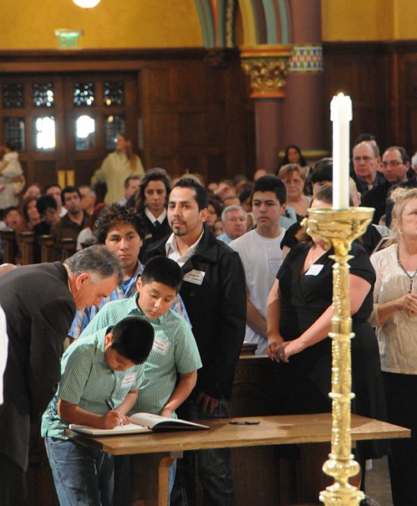 SALT LAKE CITY — Durante una ceremonia celebrando la Cuaresma pero a la vez manteniendo la solemnidad de la Pascua, la Diócesis de Salt Lake City dio la bienvenida a aquellas personas que este año serán bautizadas en la Iglesia Católica. "Mis queridos hermanos y hermanas, este es un tiempo de gran alegría para nuestra Iglesia gracias a Ustedes", dijo el Reverendísimo John C. Wester, Obispo de Salt Lake City durante el rito de Elección de los Catecúmenos y del Llamado a la Conversión Continua de los Candidatos Bautizados en la Catedral de la Magdalena. "Este es un verdadero momento de gracia". Para poder acomodar a todos los candidatos catecúmenos, sus padrinos, patrocinadores, familiares y amigos, se realizaron dos ceremonias, una el 25 de febrero y otra el 26 de febrero. Entre las personas que se unieron a los 325 Catecúmenos y a los 166 candidatos en las ce-remonias estuvo el Padre Jesuita Patrick Reuse, quien acompañó a su grupo de la Iglesia de St. Henry en Brigham City; el Padre Dominico Thuy Dang Ha, Pastor de Our Lady of Perpetual Help en Kearns, y el Reverendisimo Sylvester Ryan, Obispo emérito de Monterrey California, quien estaba en Utah para la presentación de un retiro de Cuaresma que se realizo en la Iglesia de St. Ambrose en Salt Lake City. Algunos Catecúmenos no pudieron asistir a la ceremonia debido a las grandes distancias, pero grupos de la Parroquia de Cristo Rey en Cedar City y de la parroquia de St. George viajaron más de 200 millas para ser presentados ante el Obispo. Todos los candidatos y los catecúmenos han estado formando su fe durante todo el año pasado a través de educación y discernimiento. Los catecúmenos completaron el Rito de Elección firmando el Libro de Elección durante la ceremonia, el cual después fue firmado por el Obispo Wester para luego ser regresado a los feligreses para que la comunidad pueda orar por todos los que se unirán a la Iglesia en la Vigilia de la Pascua. Los candidatos fueron presentados por el Obispo Wester. Ellos también se unirán a la Iglesia en la Pascua. En general, la diferencia entre los catecúmenos y los candidatos es que un candidato ya ha sido bautizado mientras que un catecúmeno no. El Obispo Wester dijo que durante la ceremonia las lecturas Génesis. 9:8-15, 1 Pedro 3:18-22 and Marco 1:12-15- revelaron grandes verdades teológicas. "Y aún a la mitad e todo esto, no me gustaría perder algo en el corazón de todo esto, y eso es que Jesús, Dios en su perfección, quien es trascendente, quien es poderoso, quien no necesitan nada ni a nadie, El nos creo con su inmensurable expresión de amor por nosotros, dándonos a su único hijo quien murió en la cruz y resucitó". Conforme los catecúmenos y candidatos se acercan a las últimas semanas de su preparación para ser bautizados y confirmados en la Eucaristía el Obispo Wester los animó a que todos los días dediquen un espacio para orar por sus corazones. "No es algo que realizamos por obli-gación", dijo el Obispo Wester. "Este es un tiempo para estar con aquel quien nos mama… en estos últimos días de Cuaresma los animo a aferrarse a Cristo. Que Dios los guíe en su camino en estas últimas semanas antes de la Pascua… siempre recuerden, ustedes pertenecen a Cristo".
