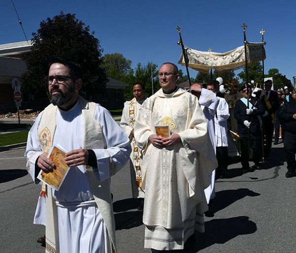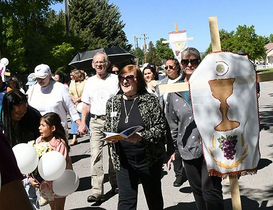 Los peregrinos viajando por la ruta de San Junípero Serra del Avivamiento Eucarístico Nacional llegaron a Utah el 31 de mayo. El viernes por la mañana el padre John Evans, en representación del Obispo Oscar A. Solis, viajó de la Iglesia Católica de St. Peter’s en Preston, Idaho, para asistir a la celebración en la cual el peregrinaje fue pasado de la Diócesis de Boise, acompañado de varios sacerdotes diocesanos así como por feligreses de toda la diócesis de Salt Lake City.