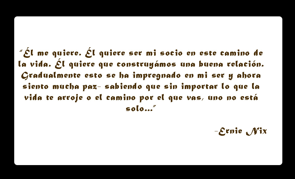 “Basándome en esa línea, me llevó a saber que el buen Señor siempre está conmigo,” dijo. “Él me quiere. Él quiere ser mi socio en este camino de la vida. Él quiere que construyámos una buena relación. Gradualmente esto se ha impregnado en mi ser y ahora siento mucha paz- sabiendo que sin importar lo que la vida te arroje o el camino por el que vas uno no está solo. Fue ese tipo de conversación la que nos sacó de ese desierto en el que estábamos.”