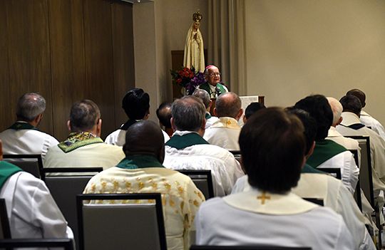 The retreat is a time for the priests to undertake continued spiritual formation and enjoy fellowship, Bishop Oscar A. Solis said. A good thing about the retreat is that it “gives ourselves … time to pray together as priests,” he added. “That’s a beautiful thing.”