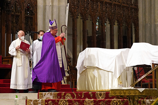 El Cardenal de Nueva York Timothy M. Dolan dirige un servicio de oración el 11 de julio de 2020 en la Catedral de San Patricio en la ciudad de Nueva York durante el cual bendijo los restos cremados de 250 mexicanos que habían muerto por COVID-19. La mayoría de los fallecidos habían sido empleados como trabajadores de primera línea en el área de Nueva York. El consulado mexicano en Nueva York ayudó a planificar la liturgia y organizó el transporte aéreo de las cenizas a México después del servicio.