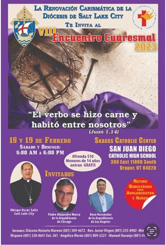El VIII Encuentro Cuaresmal de la Renovación Carismática de la Diócesis de Salt Lake City se celebrará del 17 al 19 de febrero en el Centro Católico Skaggs en Draper.