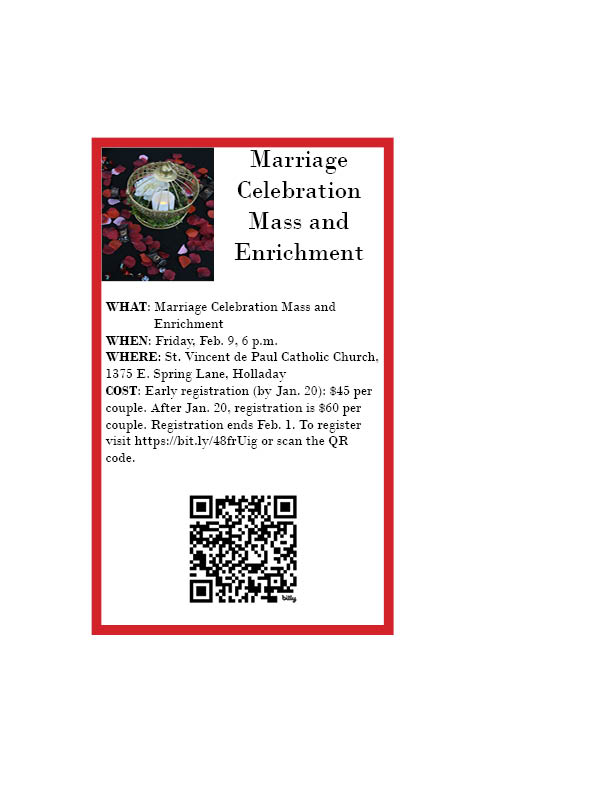 SALT LAKE CITY — The Diocese of Salt Lake City will hold its annual Marriage Celebration Mass and Enrichment Feb. 9 at St. Vincent de Paul Catholic Church in Holladay.