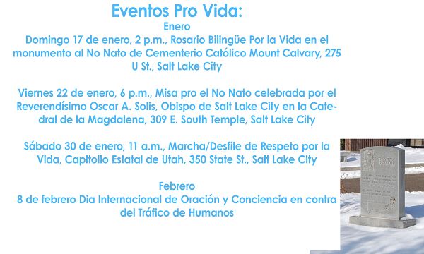 El Rosario Bilingüe anual está programado para el domingo 17 de enero en el cementerio Católico Mount Calvary; el viernes 22 de enero el Reverendísimo Oscar A. Solis, Obispo de Salt Lake City presidirá la Misa por el No Nato en la Catedral de la Magdalena, tradición que comenzó hace tres años.