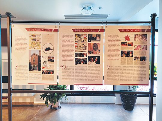 Due to space constraints, the display at Christ the King Catholic Church is limited to six panels at a time; they are displayed in alphabetical order by country. The display began in February, and the panels are changed every two weeks.