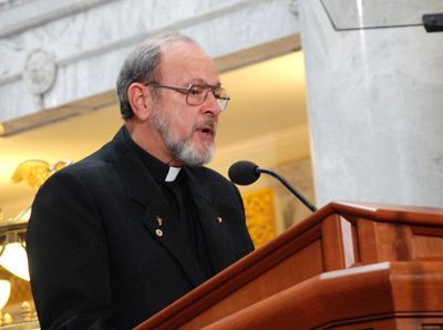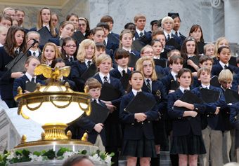 SALT LAKE CITY — A formal re-dedication ceremony Jan. 4 kicked off a week-long series of ceremonies marking the re-opening of the Utah State Capitol after more than six years of restoration. The estimated $61 million project includes 285 base isolators on which the Capitol now safely sits, and hundreds of miles of wire making this Capitol one of the most technologically advanced and seismically secure buildings in the United States, said David A Hart, executive director of the Capitol Preservation Board and architect of the Utah State Capitol. The formal re-dedication ceremony began with musical selections by the International Childrens’s Choir. Dick Nourse, retired news anchor for KSL Television served as Master of Ceremonies. First Lady Mary Kaye Huntsman began a massive ringing of bells by members of the Bells on Temple Square and area bell choirs, joined by everyone seated in the rotunda ringing small bells. Patriotic songs followed as the Utah National Guard presented the state and national colors. Pastor Charles Petty of Second Baptist Church, Ogden offered an invocation, followed by "Into Light," an anthem written especially for the occasion by Katherine Coles, Poet Laureate of Utah, and Kurt Bestor. "My friends and fellow Utahns – today we celebrate Utah’s 112th birthday," said Gov. Jon Huntsman. How appropriate therefore that we have gathered to rededicate this great symbol of statehood – our capitol. Gov. Huntsman welcomes past governors, legislators, and judges; Haven Barlow, "whose work in the legislature spanned a third of our state’s history and the administration of six governors," and all Utah citizens. Following remarks by Hart and Gov. Huntsman, other speakers followed, including Senate President John L. Valentine, Speaker of the House Greg J. Curtis, and Utah Supreme Court Justice Christine M. Durham. Choristers of the Cathedral of the Madeleine Choir School joined the Mormon Tabernacle Choir, the Orchestra at Temple Square, and Ralph Matson to sing, "Utah We Love Thee," followed by remarks by President Gordon B. Hinckly of the Church of Jesus Christ of Latter-Day Saints. The combined choirs, orchestra and bell choirs then sang and played "The Battle Hymn of the Republic." "Almighty and eternal God, you have revealed your glory to all nations," Father Donald E. Hope, pastor of Notre Dame de Lourdes Parish, Price, said in his prayer of Benediction. "God of power and might, wisdom and justice, through you authority is rightly administered, laws are enacted, and judgment is decreed." Fr. Hope asked for blessings on the human hearts present and those who worked on the project. He asked for God’s help in achieving peace, justice, freedom, and equality for all the citizens of Utah.