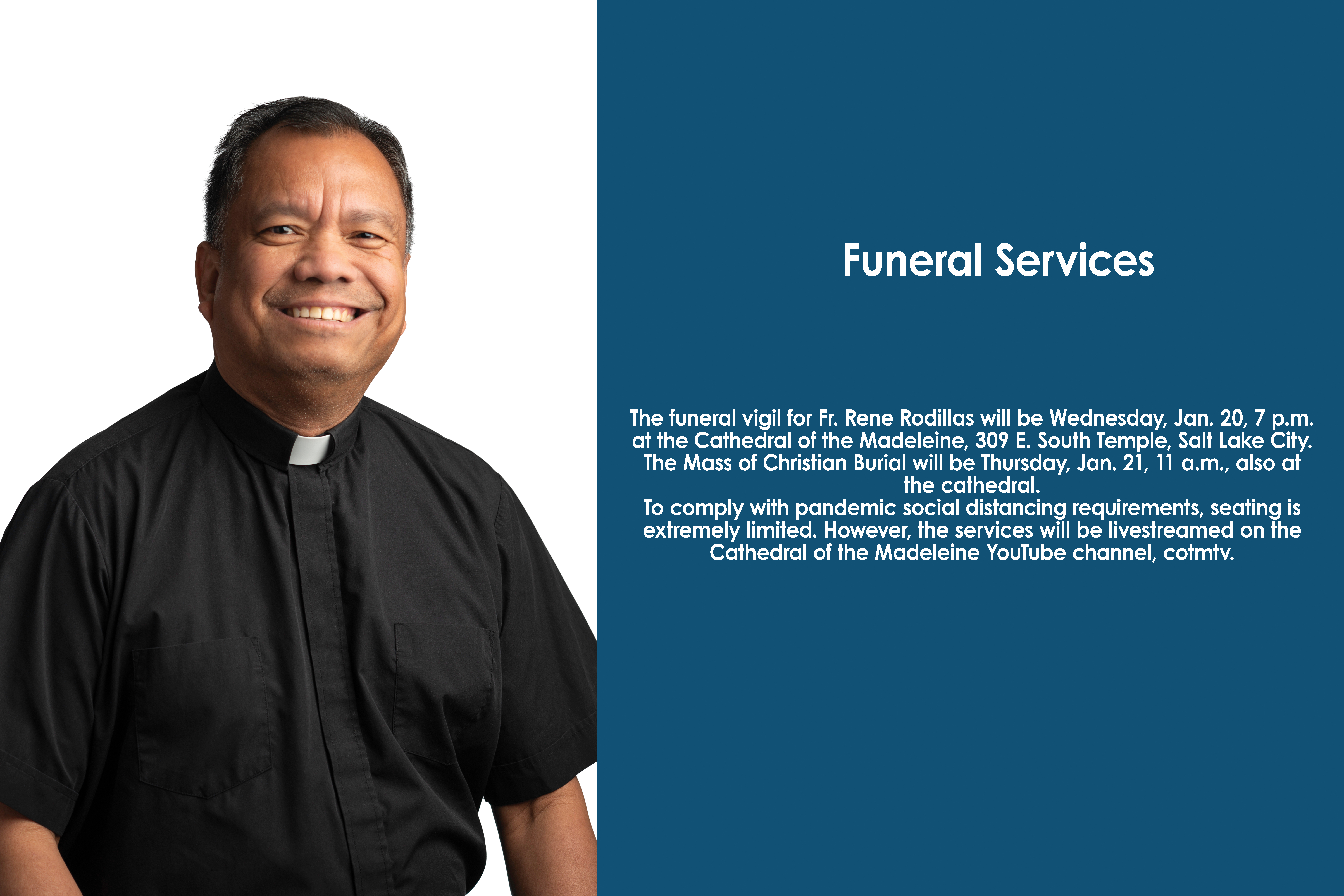 The funeral vigil for Fr. Rodillas will be Wednesday, Jan. 20, 7 p.m. at the Cathedral of the Madeleine, 309 E. South Temple. The Mass of Christian Burial will be Thursday, Jan. 21, 11 a.m., also at the cathedral.