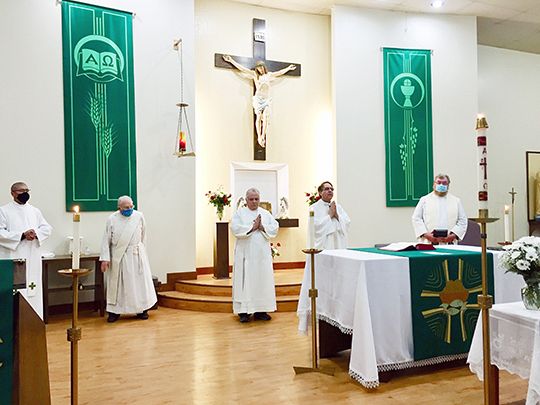 The deacons are Deacon Mansueto Flaim, Deacon Jim Garcia, Deacon Rick Huffman, Deacon Joe H. Cormier and Deacon William Januszewski, all of whom are assigned to St. Marguerite’s; and Deacon Bob Carranza and Deacon Mark Bourget, both of whom are deceased.