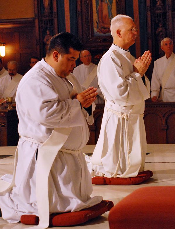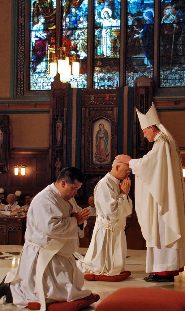 SALT LAKE CITY — The Diocese of Salt Lake City has long depended on the generosity and the spirit of foreign-born priests to continue its ministry and its life here. May 31 saw two more men, Father José Gregorio Rausseo Gómez, a native of Venezuela, and Father Manuel de Jesús Cerón Valdéz of Mexico ordained to the priesthood for the Diocese of Salt Lake City by Bishop John C. Wester in the Cathedral of the Madeleine. In a bi-lingual ceremony that included participation by members of the ordinands’ families, Father Colin Bircumshaw, pastor of St. Ann Parish and diocesan vocations director, called forth then-Deacons Rausseo and Cerón. vouching for their worthiness to be ordained.