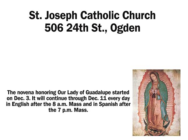 The novena honoring Our Lady of Guadalupe started on Dec. 3 and will continue through Friday, Dec. 11 with a rosary at 7 p.m. and Mass at 7:30 p.m. nightly. On Friday, Dec. 11, there will be Adoration of the Blessed Sacrament from 7 to 9 p.m., followed by Mass and serenade. On Saturday, Dec. 12, Mass will be at 11 a.m.