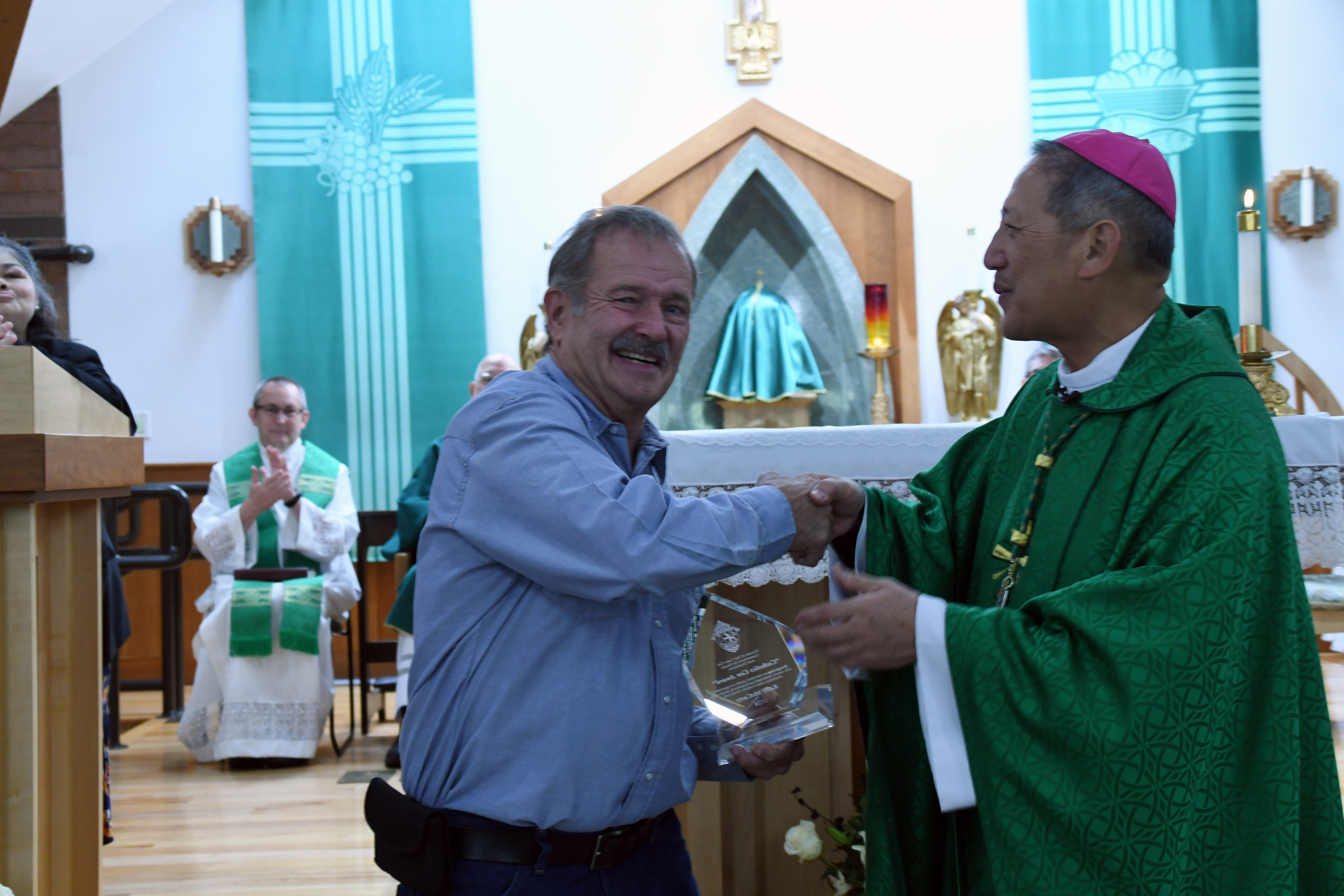 El Obispo Oscar A. Solis presidió la Misa; concelebrando estuvieron el padre John Evans, vicario general y el padre Jose Rausseo, pastor. El diácono Gerardo Marrufo asistió la celebración; el diácono Lynn Johnson fue le maestro de ceremonias. David de León, feligrés de la parroquia de Santa Teresita y quien el 2017 recibió el premio fue uno de los lectores. Entre los asistentes estuvieron miembros de la Comisión Diocesana para personas con discapacidades. Carol Ruddell, miembro de la comisión ofreció la traducción en lenguaje de señas.