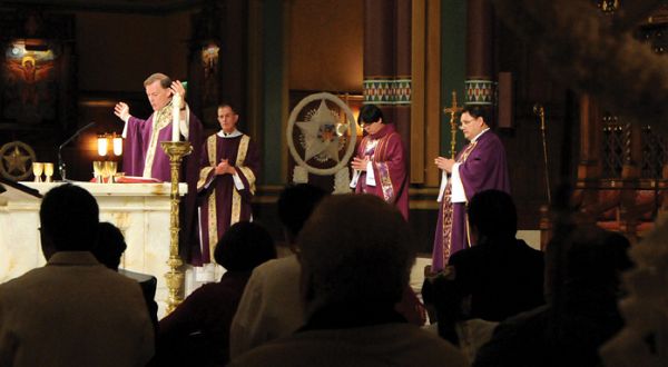 The Diocese of Salt Lake City began its Simbang Gabi novena on Dec. 16 with a Mass celebrated by the Most Rev. John C. Wester, Bishop of Salt Lake City, at the Cathedral of the Madeleine. Simbang Gabi is an Advent tradition of the Philippines. Shown celebrating the Mass are (from left) Bishop Wester; Deacon Lynn Johnson; Father Joey Frez, parochial vicar of Saint Francis Xavier Parish in Kearns; and Father Eleazar Silva, parochial vicar of the Cathedral of the Madeleine. The star-shaped lanterns are traditional Simbang Gabi decorations that represent the Star of Bethlehem. IC photo/Marie Mischel