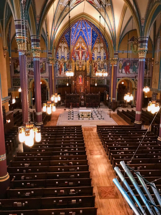During the 1990s restoration, the cathedral was closed for two years while the interior was gutted and the entire floor was sanded. This time around, the decision was made to not close the doors while the work was being done. Sanding the floor also was deemed unwise because of the cost and also because the sawdust would damage the cathedral’s historic Kenneth Jones organ.