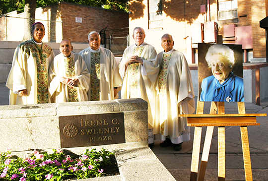 Shown in the newly dedicated Irene C. Sweeney Plaza behind the Cathedral of the Madeleine are (from left) Bishop Oscar A. Solis, Msgr. J. Terrence Fitzgerald, Msgr. Joseph M. Mayo, Msgr. M. Francis Mannion and Father Martin Diaz. IC photo/Marie Mischel