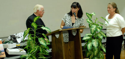 TOOELE— Food and fun were the orders of the evening July 29 as St. Marguerite Parish celebrated the retirement of Father Matthew O. Wixted, their pastor for 12 years. The party was an informal one, with representatives of the Tooele City Council and Dugway Proving Ground in attendance. Bruce Cummings welcomed everyone in, and Capt. Slade, from Dugway, presented Fr. Wixted with a plaque honoring him for his service on behalf of the men and women there. "God sees some of the greatest efforts from people who serve in the smallest places," Capt. Slade said. "What Fr. Wixted has done for the soldiers at Dugway has had a profound effect." Fr. Wixted also received a plaque from Chaplain Roggia, also from Dugway. Fr. Wixted, a native of Thurles in County Tipperary, Ireland, was ordained for the Diocese of Salt Lake City June 10, 1962, in Ireland. In his 46 years of priesthood he has served in Ogden, Copperton, Price, Salt Lake City, Moab, Richfield, and Midvale. Before being assigned to St. Marguerite Parish, Tooele, he served for 12 years at St. Therese of the Child Jesus Parish, Midvale. His parishioners took advantage of Fr. Wixted’s sense of humor at the party. Jim McManaman said Fr. taught them patience by living up to his motto: "They can’t start without me." He kidded Fr. Wixted about missing finance meetings, and presented him with a golf trophy. "Fr. Matt always had the interest of people at heart, and we knew we came first with him," McManaman said. Joe Ortega recalled the time when Fr. Wixted went to Las Vegas in his car, but returned on an airplane because his car was totaled in Las Vegas. "We wanted to get you your dream car," Ortega said. "We know for a time your dream car was a Mercedes Benz, but we couldn’t find one of those. We we so happy when you decided your dream car was a Jaguar, because we knew we could find one of those." Ortega helped Fr. Wixted open a shoe-box sized package. In it was a shoe-box sized Jaguar. Fr. Wixted responded with his characteristic laugh. Fr. Wixted has planned a trip to California, on which he will be accompanied by his sister, Presentation Sister Mary Wixted and their sister-in-law Maire Wixted, both of whom attended his retirement party. Members of St. Marguerite Parish’s Catholic Woman’s League presented Fr. Wixted with a check toward his trip. "As I move on from here," Fr. Wixted said, "I will always think of St. Marguerite Parish as my home. "This parish has a strong concern for the entire community of Tooele. I am deeply grateful to all of you because you are the church," he said. "Many of you have taken leadership roles in the parish and in the school, and it has always been very meaningful when we came together to celebrate the Eucharist. You are one of the great gifts of my priesthood and I will miss you."