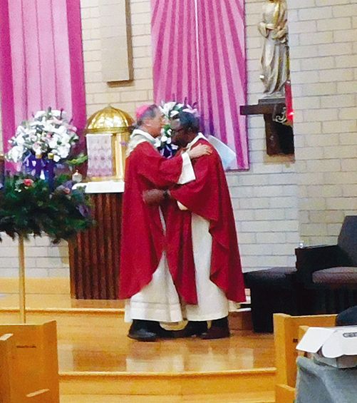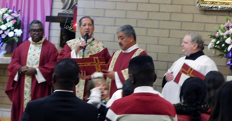 Shown during the Thanksgiving Mass for the 25th ordination anniversary of Fr. Sebastien Sasa Nganomo Babisayone are, from left, Fr. Sasa, Bishop Oscar A. Solis, Deacon Vicente Vasquez and Deacon Dale Dillon. IC photo/Laura Vallejo