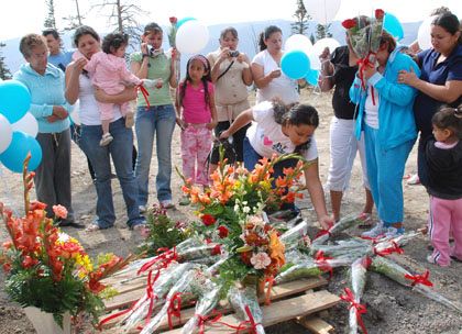 HUNTINGTON The wrenching search for six lost mines was over, leaving only funerals, a public memorial service, and a private committal service for the families of the three Catholic miners. A funeral Mass for Luís Hernandez and Juan Carlos Payan was celebrated Sept. 6 at Mission San Rafael in Huntington. Concelebrated by Father Donald E. Hope, pastor of Notre Dame de Lourdes Parish, Price, Father Omar Ontiveros of the Cathedral of the Madeleine, and Father Oscar Martinez of St. Joseph Parish, Ogden, the emphasis of the Mass was on resurrection. Fr. Hope called the funeral Mass "a bittersweet occasion," and encouraged family members to remember the miners as, "those who taught you how to love one another. Now we ask God to bring them to himself." A second funeral Mass, for Manuel "Manny" Sanchez, will be celebrated Sept. 15 at Notre Dame de Lourdes Church in Price. At a public memorial service for all nine lost miners Sept. 9, Bishop John C. Wester, a guest speaker, spoke to the crowd in both English and Spanish. On a deep level, he said, nothing could be further from the truth than all hope is gone. "Our hope is in God; our hope is in Jesus Christ, who conquered death and gave us eternal life through his cross and resurrection... "There is another reason for our hope today," the bishop said. "I believe that all of us in Utah are convinced that your relatives are true heroes..." On Sept. 10, 25 members of the Hernandez and Payan families, led by an Emery County Deputy Sheriff, made their way up the rugged hill to the seventh bore hole drilled in the fruitless search for the six trapped miners. There, Bishop Wester and Fr. Hope blessed the ground and said prayers of commital. Grieving family members lay roses on the pallet covering the bore hole and released balloons for all nine lost miners. Each family member sprinkled the site with holy water, and spent silent time at the site. As the service ended, a lone eagle flew over the site, paused, and soared away.