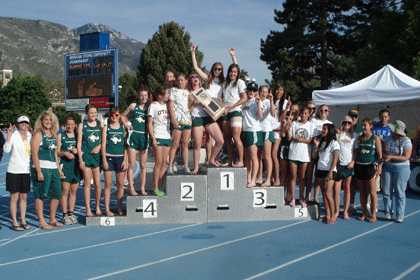 OGDEN — Despite a lot of unfortunate injuries the girls on the Saint Joseph Catholic High School track team stuck with it and won their second straight State Championship title May 16, at Brigham Young University. "We lost our leading distance runner Andrea Chavez to a basketball injury this year. Tauna DeHaan, Alex Shaw and Carissa Bauer also had injuries all year," said Saint Joseph track coach Joseph Loffredo. "They persevered by swimming, biking and weight training with Assistant Coach Lisa Reed to try to keep them in shape while they were rehabilitating their injuries. "We won our region championship," said Loffredo. "Bauer won the 100 meter, 200 meter, and 400 meter, and was the anchor on our first place 4x100 relay team. But we lost the Brigham Young University Invitational to Monticello High School. "When we got to the State meet, our leading runner and point getter for the last three years and past State Champion in four events, Bauer, pulled a hamstring the first day of the State meet in her first race," said Loffredo. "In my three years of coaching, this was the most gut-wrenching and yet the most courageous race I have witnessed as she won her heat and qualified for the finals limping in on one leg. "After the first day, we were in fourth place 11 points behind Rich High School, and Monticello High School, after the first day," said Loffredo. "We had a team meeting and asked the girls to win this for Carissa, to put forth our best effort to win every possible point, but also putting added pressure on the girls in the competition." Loffredo said the girls came out and performed above and beyond and won the State Championship by 30 points over Rich High School. "We won only one event – the 4x400 meter Relay, and that was the last event of the day," said Loffredo. "Alex Shaw placed second in three events: the 3200 meters, 1600 meters, and the 800 meters. She went from fifth place in the last turn of the 800 meter to finish second. "Tauna DeHaan scored points in four events: the 400 meter, the 800 meter, and in two relays, the 4x100 and 4x400, where she was the anchor and came back from second place to win the relay. This is the only event we won all day," said Loffredo. "Michelle Howe and Jennifer Beaudoin placed in the hurdles and relay events," said Loffredo. "Alison Wiechmann and Jackie Bafford placed in the field events." Some of the first year runners are Joanna Matajasik, Megan Brandt, Emily Brandt, Nelida Navarro, Rebecca Maurice, and Taylor Remkes. Carly Minnich and Melissa Frogh are two of the most improved runners, and they turned in personal records scoring points. Michelle Howe scored points in the 100 and 300 meter hurdles and in two relay events. "One of our four seniors, Jennifer Beaudoin, scored points in the 100 meter hurdles and in the 4x100 relay team," said Loffredo. "DeHaan came back from her injuries to score points in the 400 meters, 800 meters, 4x100, and was the anchor on the winning 4x400 meter relay team." Loffredo said JoAnna Matajasik, Rebecca Maurice, Colleen Cilwick, Rebecca Brandt, Emily Brandt, Taylor Remkes and Nelida Navarro set personal records contributing mightily to the win. Sarah Paur, Shannon Fallon, Kelsey Minnoch, Meg Baker also contributed to a successful track year. Loffredo said all the girls are just amazing, competitive athletes. Assistant coaches Reed and Javier Chavez were instrumental in training and inspiring these athletes. "It was truly a team effort as we won only one event, but won the State Championship by 30 points," said Loffredo. "After accepting the trophy, Chavez, the long distance coach led our team on a victory lap around the BYU track facility."