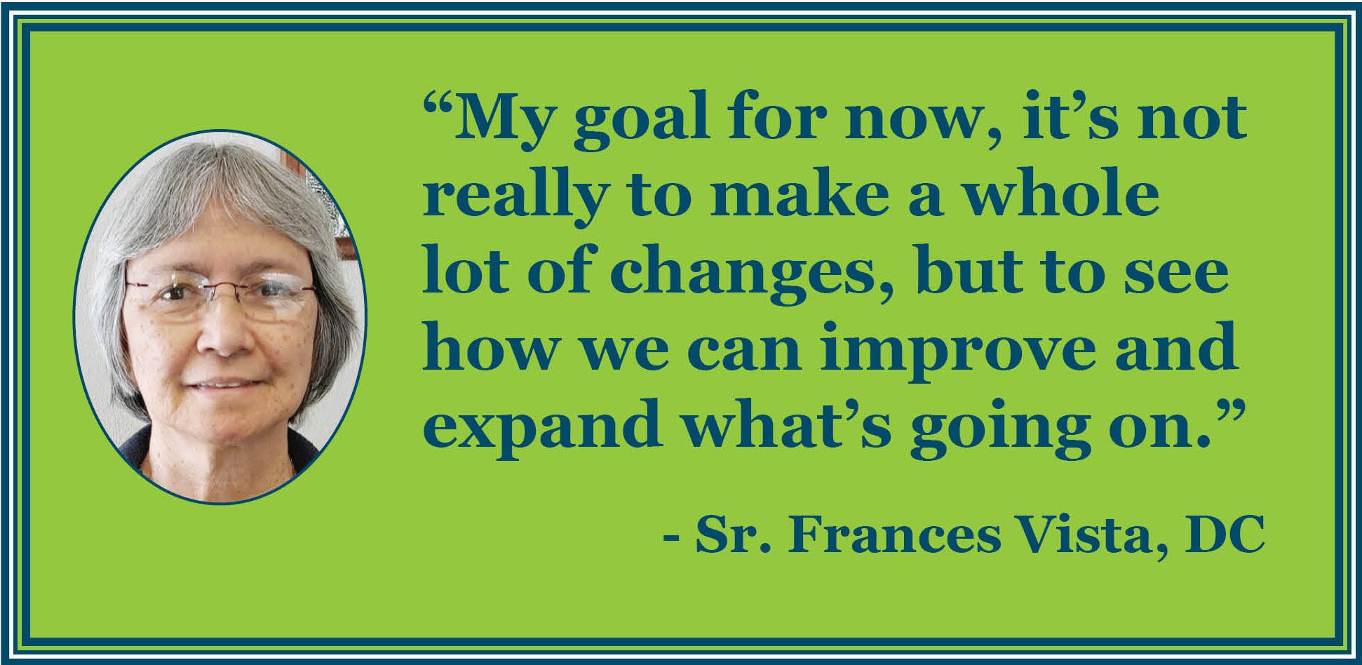 A Daughter of Charity for 43 years, Sr. Frances is originally from Manila, the Philippines. She grew up in a Catholic home with a particular devotion to the Sacred Heart and as a child felt drawn to the religious life. However, as she got older, she forgot this prompting for several years and didn’t discern her calling until 1975, after she and her family moved to San Francisco, and “just suddenly, I saw a sister, one of the Daughters of Charity, and it just dawned on me at one point I thought of becoming a sister, and that was the beginning of the reawakening of the calling,” she said.