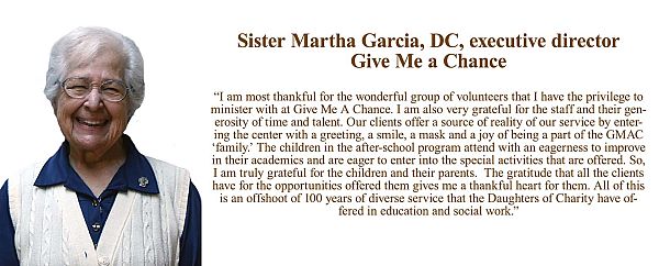 “I am most thankful for the wonderful group of volunteers that I have the privilege to minister with at Give Me A Chance. I am also very grateful for the staff and their generosity of time and talent. Our clients offer a source of reality of our service by entering the center with a greeting, a smile, a mask and a joy of being a part of the GMAC ‘family.’ The children in the after-school program attend with an eagerness to improve in their academics and are eager to enter into the special activities that are offered. So, I am truly grateful for the children and their parents. The gratitude that all the clients have for the opportunities offered them gives me a thankful heart for them. All of this is an offshoot of 100 years of diverse service that the Daughters of Charity have offered in education and social work.”