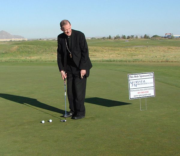 Bishop John C. Wester gets the 5th Annual Our Lady of Lourdes in Magna Golf Tournament started at 7:30 a.m. sharp at Stonebridge Golf Course June 30. The tournament was sponsored by the Our Lady of Lourdes Parish Council. Bishop Wester was a natural in the putting contest, which raised $1,010 for the parish.