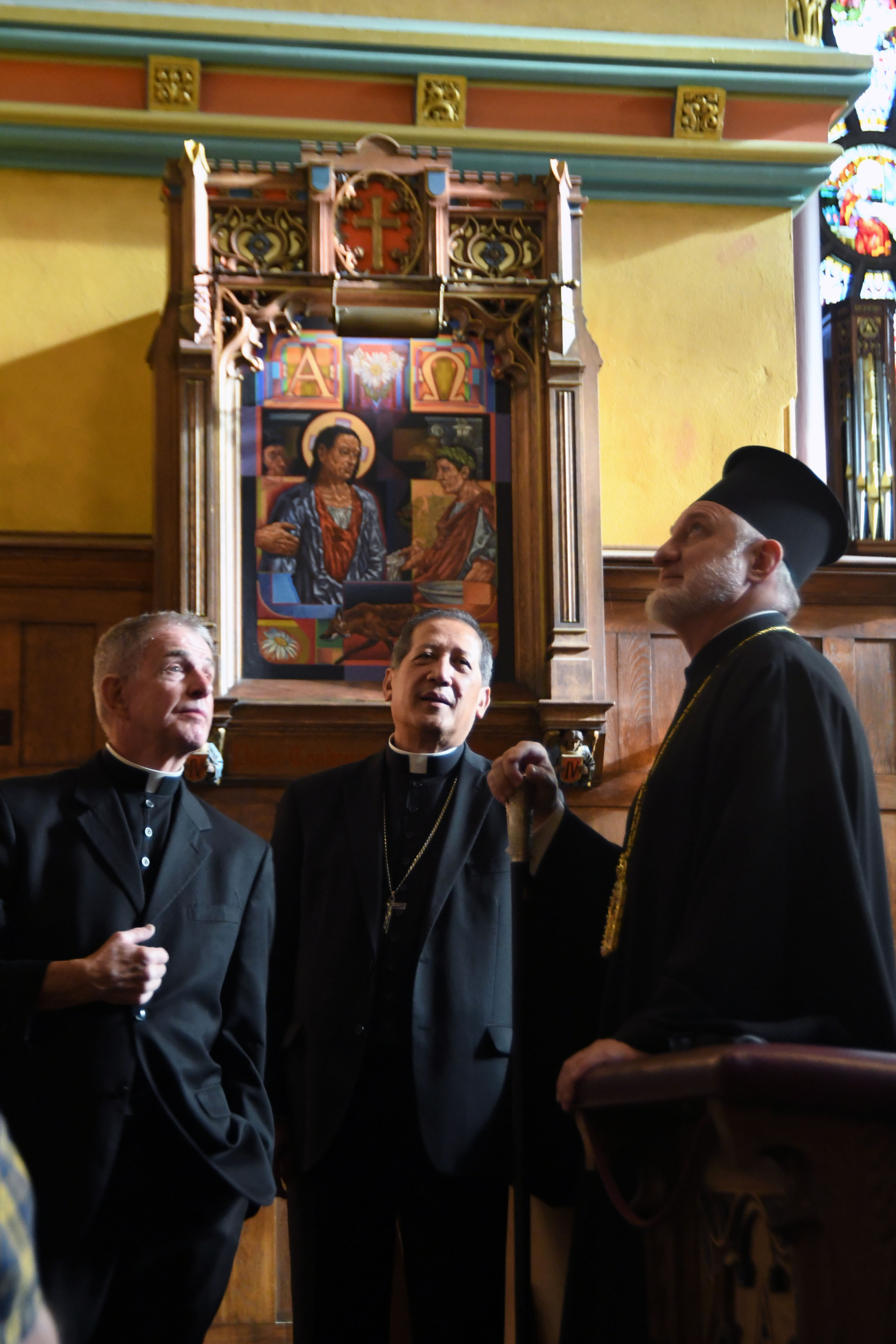 On July 20, His Eminence, Archbishop Elpidophoros of America (right) was welcomed to Utah by the Most Rev. Oscar A. Solis (center), 10th Bishop of Salt Lake City, at a reception at the Catholic diocese’s Pastoral Center. This was the first visit to Utah of the leader of the Greek Orthodox Archdiocese of America since his appointment in 2019. Those attending the reception included members of the Catholic diocese, the Salt Lake Interfaith Roundtable board of directors and the Greek Orthodox Church of Greater Salt Lake. After the reception, the archbishop was given a tour of the Cathedral of the Madeleine, led by Deacon Lynn Johnson and accompanied by Bishop Solis.
